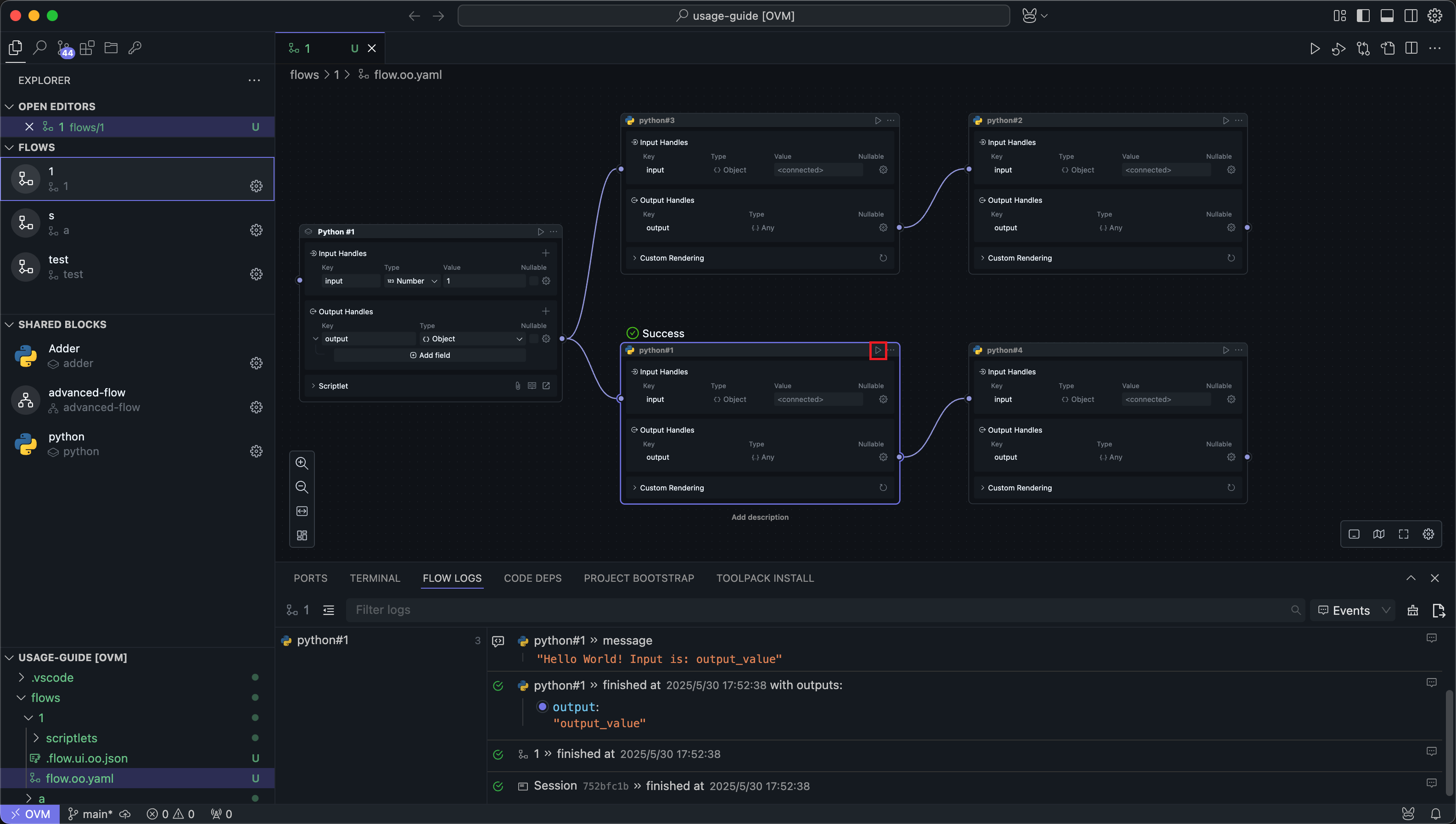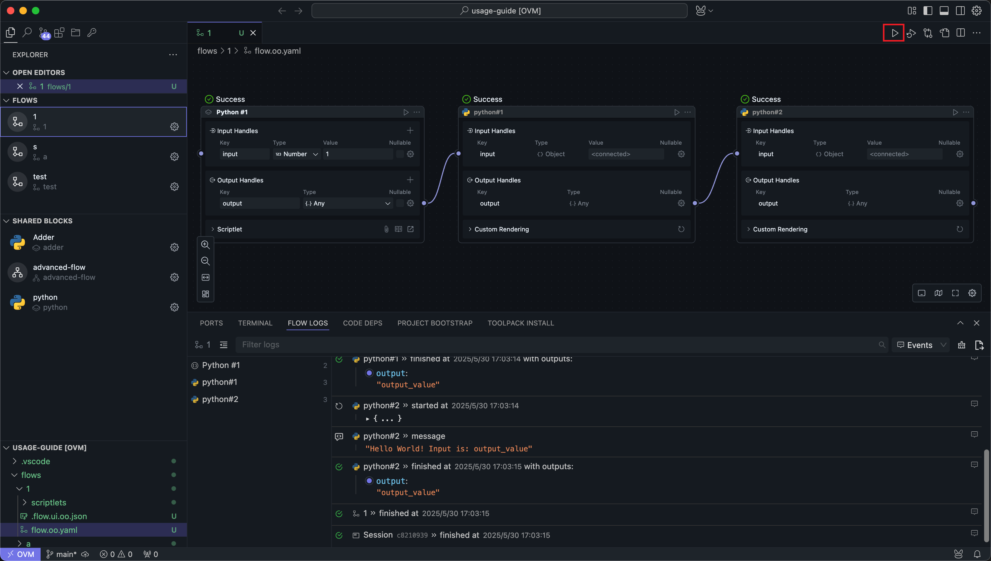 In the top menu of the central panel, click the leftmost run button to run the entire Flow.